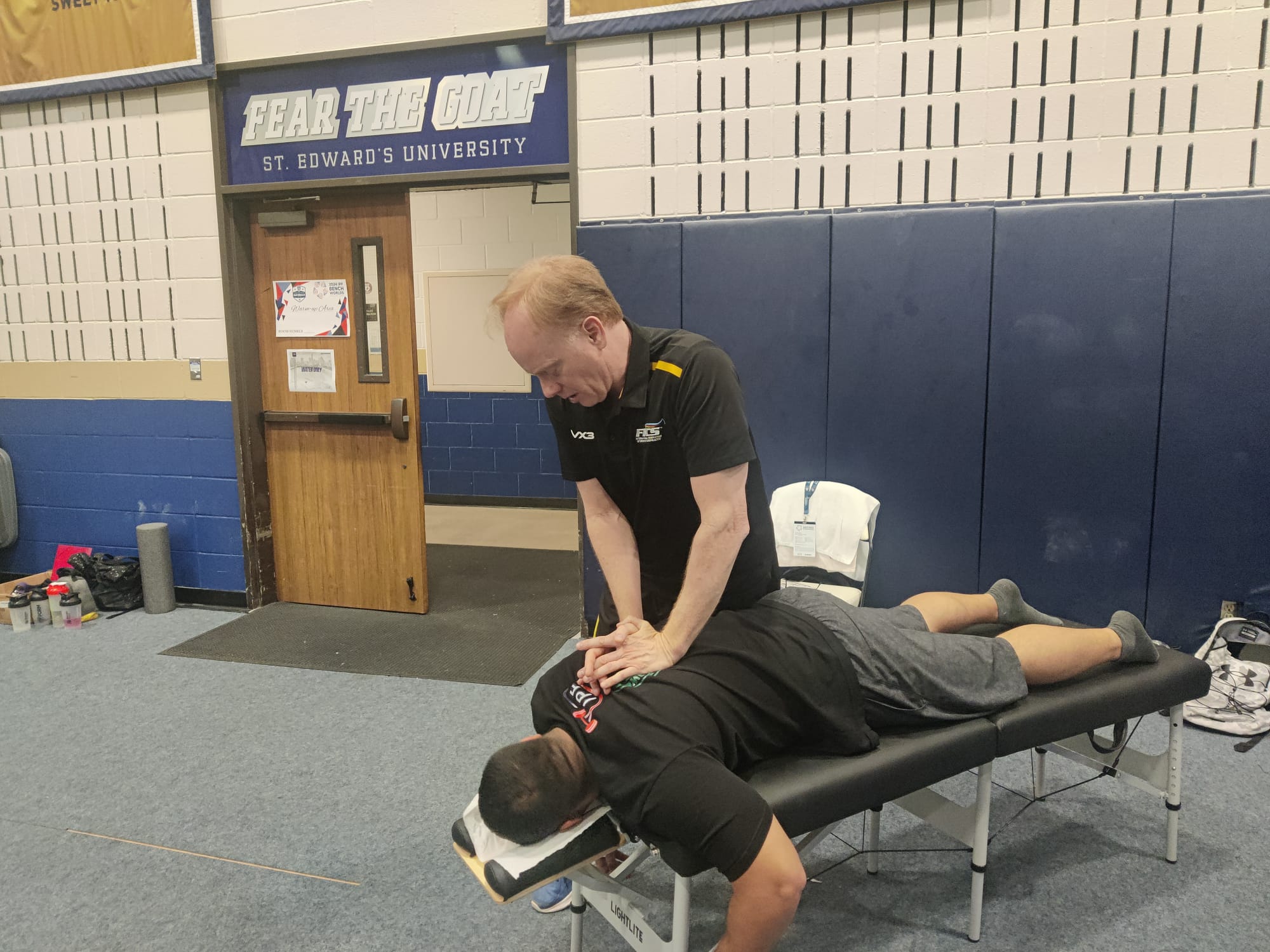 Dr. Nikki Wan (Austin, TX) came later in the first week and continued on alternate days into the second week. Drs. Cynthia VanSickler (Davenport, IA) and Mark Strudwick (Victoria, BC) rounded out the team in the second week. Everyone involved in the event stayed at the local Marriott locations, where we would shuttle by bus over to the venue at St. Edward’s University. Eleiko, one of the event sponsors, has its U.S. headquarters in Austin, a training facility for lifters and social activities. The organizers did an excellent job, as it all seemed to run pretty seamlessly. As volunteers, we were all well taken care of. There were athletic therapists on duty across the hall from us to be called upon when needed. They had a pretty quiet event.