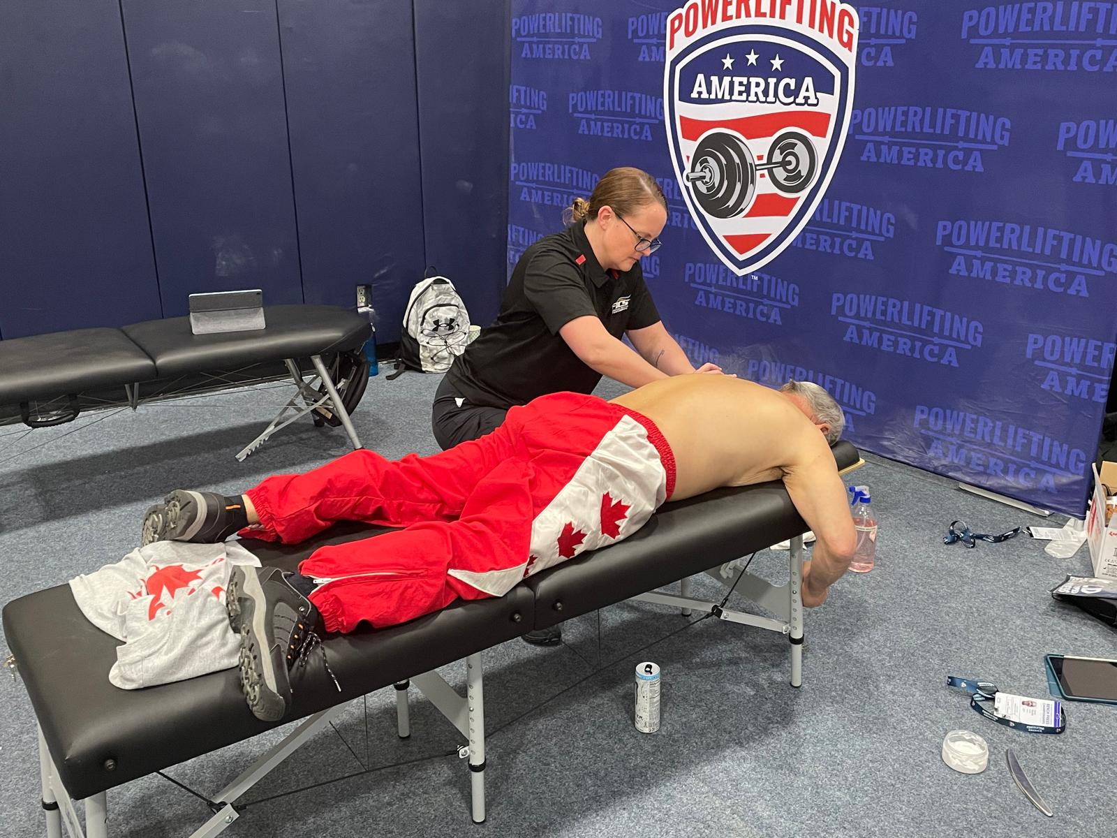 As far as numbers go, over the 11 days of the event, we had 515 patient visits, several of whom were individuals returning for follow-up care. And we all saw lifters who were new to chiropractic care after seeing a teammate or coach being treated by us and would come over. Again, the visibility of our location was an advantage as a first-timer could watch for a while before committing. As this was my second IPF event, I particularly enjoyed seeing lifters whom I had met previously and could re-acquaint and treat them again. The problems we saw tended to be shoulder issues and low back pain that were chronic in origin. There was the odd acute rotator cuff or neck strain to keep things interesting. I noticed in checking active ranges of motion how great the spinal extension is in this population compared to what I see day-to-day. The bench press technique involves getting right up on their shoulder blades, as high as possible, and then arching their backs right down to their sacrum. It is surprising how little of them are actually in contact with the bench. One morning I had breakfast with an orthopedic resident who told me that 100% of bench press lifters they see in his ‘shoulder-specialty’ office have posterior labrum tears, presumably from supporting the tremendous weight over time eventually taking its toll. It was also interesting to hear the various walks of life that the lifters come from, which I found to be just like our practices: from air traffic control, IT services, former Olympian, military, physiotherapist to osteopath, there really wasn’t an industry not represented among these folks. Powerlifting is for everyone!