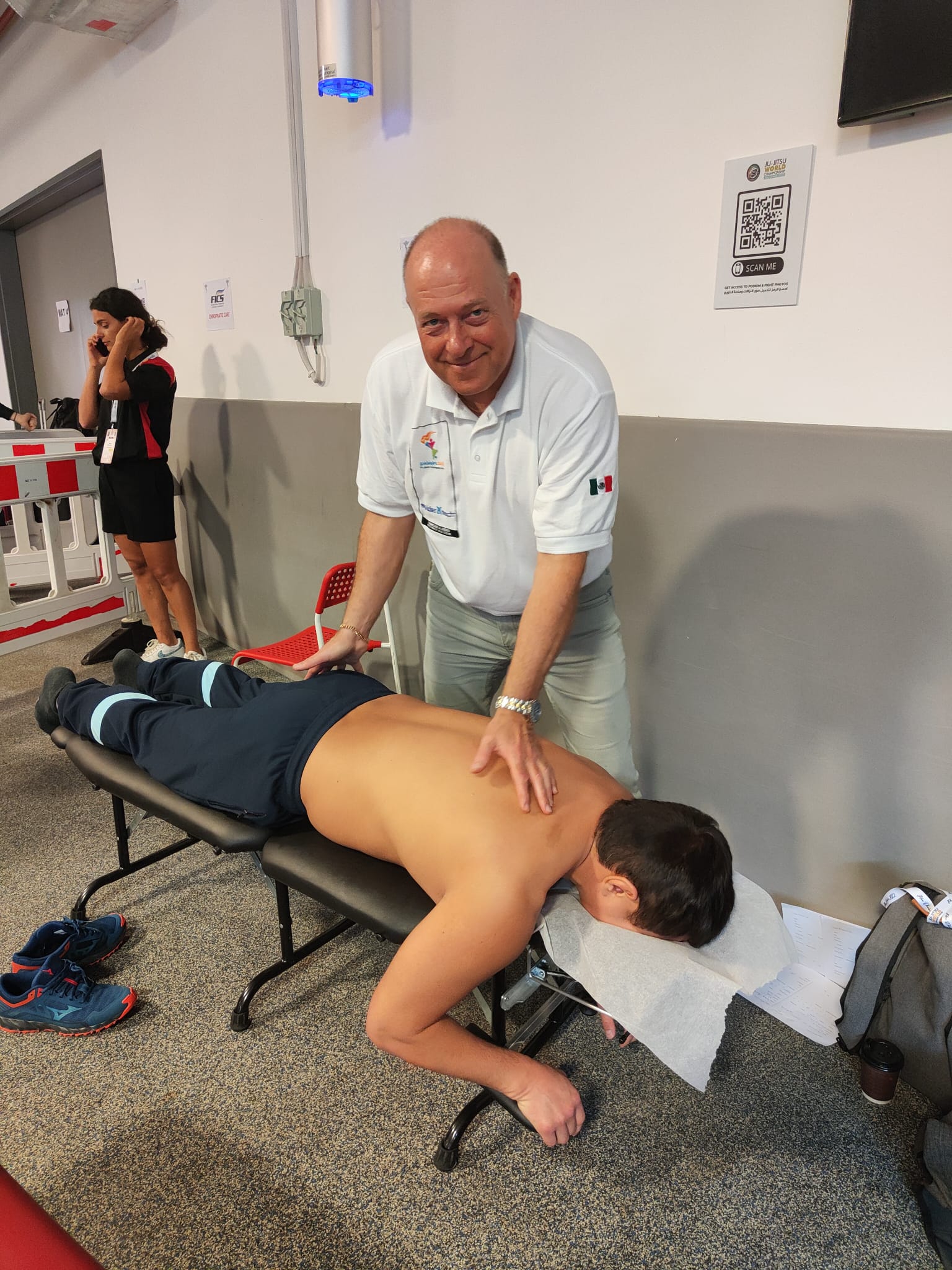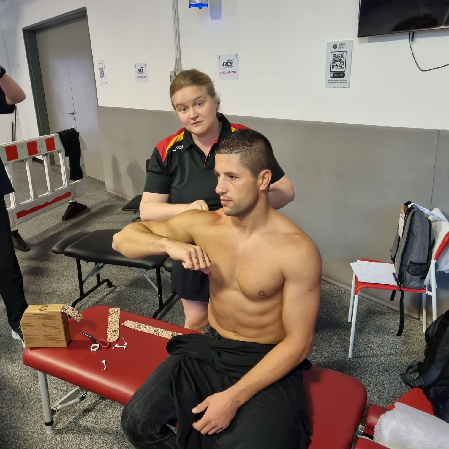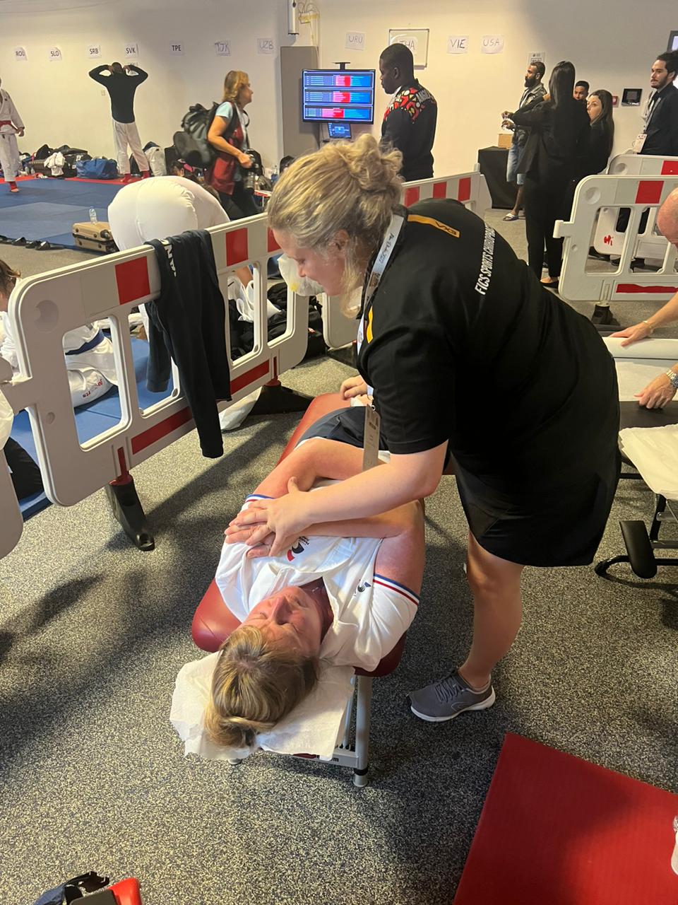 Having a dedicated space, I offered to the medical teams of the delegations present to share our dedicated space in order to facilitate the work of all. Indeed, given the large number of participants, it was important to have a defined space where we could all work calmly and facilitate the synergy of our care; we were also able to have time (coffee breaks to discuss all together and not only on the case of the athletes).